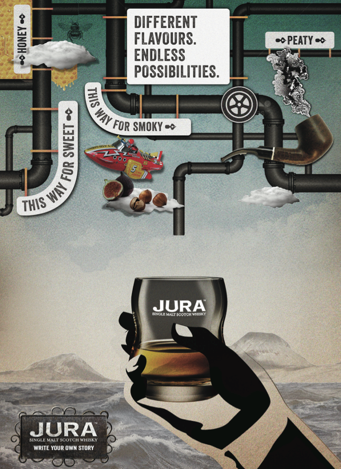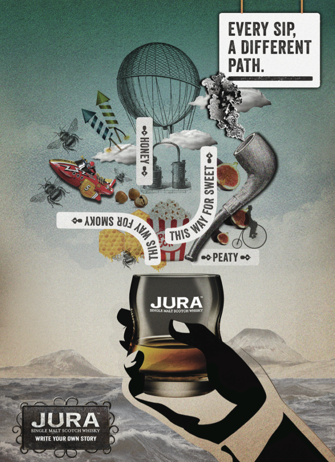 Brand campaign for Jura Whisky. Their split-distillation creates both smoky and sweet malts: two different paths from one source. We built surreal worlds and a manifesto around the idea that being yourself, however weird, feels damn good.